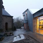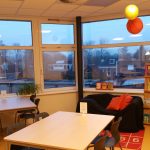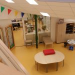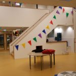 Het speellokaal is via een glazen vouwwand gescheiden van de gemeenschapsruimte en geopend vormen deze twee samen de centrale ruimte met vast podium, keuken en uitzicht op de tuin. Opgeleverd: december 2017