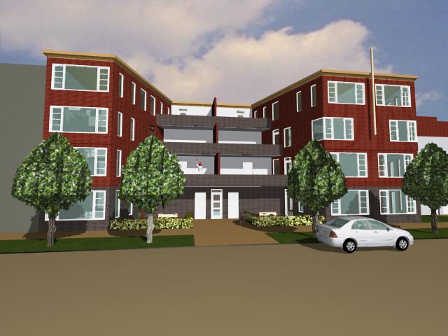 4 Lagen met appartementen aan weerszijden van de trap en de lift. En voor het trappenhuis bevinden zich aan de zonzijde de dakterrassen met daaronder de bergingen. Ieder appartement heeft een eigen berging en beneden bevinden zich gezamenlijke bergingen voor de fietsen en het afval.