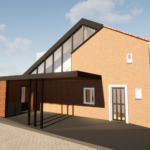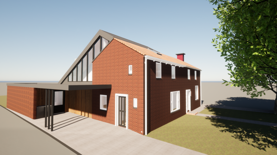 Gehecht aan de plek wilden de bewoners deze woning graag vergroten waarbij het oorspronkelijke karakter van de jaren ’50 woning behouden moest blijven. In het ontwerp zijn de voor- en zijgevels van de woning blijven staan. Het overige wordt compleet vervangen en aangebouwd. Hierdoor ontstaat een nieuwe, moderne woning die nog steeds een geheel vormt met de andere helft van deze 2 onder 1 kap woning. Aan de binnenzijde vormt de keuken de schakel tussen voor- en achterkamer. De trap is een mooi element in de woonkamer waarlangs het licht van boven de kamer in komt. Een zwarte aluminium glazen pui opent de kamer richting de tuin.
