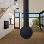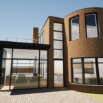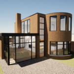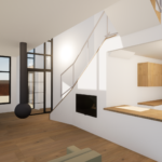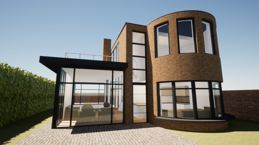 In aansluiting op de omliggende bebouwing is deze woning in Assen ontworpen met een gele baksteen en voorzien van hoge glaspuien die uitzicht bieden op de groene tuin. In het interieur doorsnijdt een vide van voor naar achteren de kamer en verbindt beneden- en bovenverdieping met elkaar. De woonkamer wordt omsloten door de trap naar boven en heeft een haard die aan het plafond hangt.