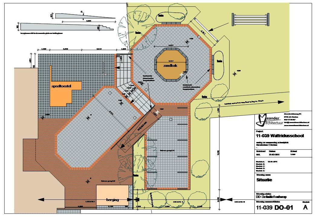 Voor de Walfridusschool in Bedum is dit ontwerp gemaakt voor een uitbreiding en verandering van het bestaande schoolplein. Meer speelruimte, eigen tuintjes en meer ruimte voor fietsenstalling waren de uitgangspunten voor dit plan. In de uitbreiding ligt de zandbak centraal in een achthoekig plein, dat verlaagd ligt ten opzichte van het grote speelterrein. Via trappen en een hellingbaan kun je …
